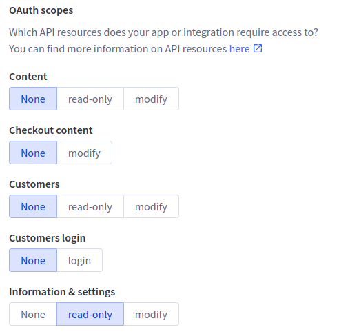 Los permisos (OAuth scopes) que le demos a la clave dependerán de las llamadas que queramos hacer a la API y ya describimos en la primera parte del artículo como deducir que permisos necesitamos. Para nuestra sencilla App solo necesitamos acceso de lectura a la información y configuración básica de la tienda: