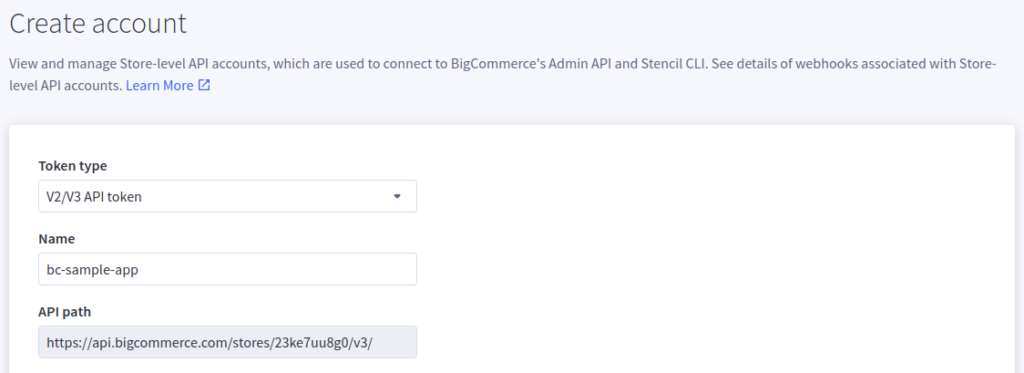 BC_LOCAL_STORE_HASH=<api-account-store-hash>Para poder asignar un valor a estas variables, debemos ir a nuestra tienda Sandbox y crear una clave de API para desarrolladores: Settings > Store-level API accounts > Create API account